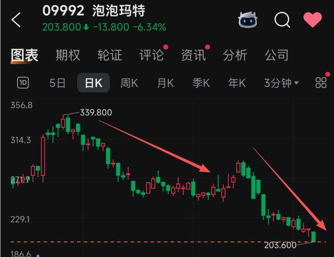 在 8 月 26 日创下 339.8 港元 / 股的历史峰值后,泡泡玛特的股价便一路走低,目前股价已经接近 200 港元,累计跌幅已逼近 40%