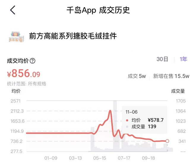 以 LABUBU 为例,前方高能系列搪胶毛绒挂件成交均价,已经从巅峰时期的超过 2000 元,一路跌至 600 元以下。