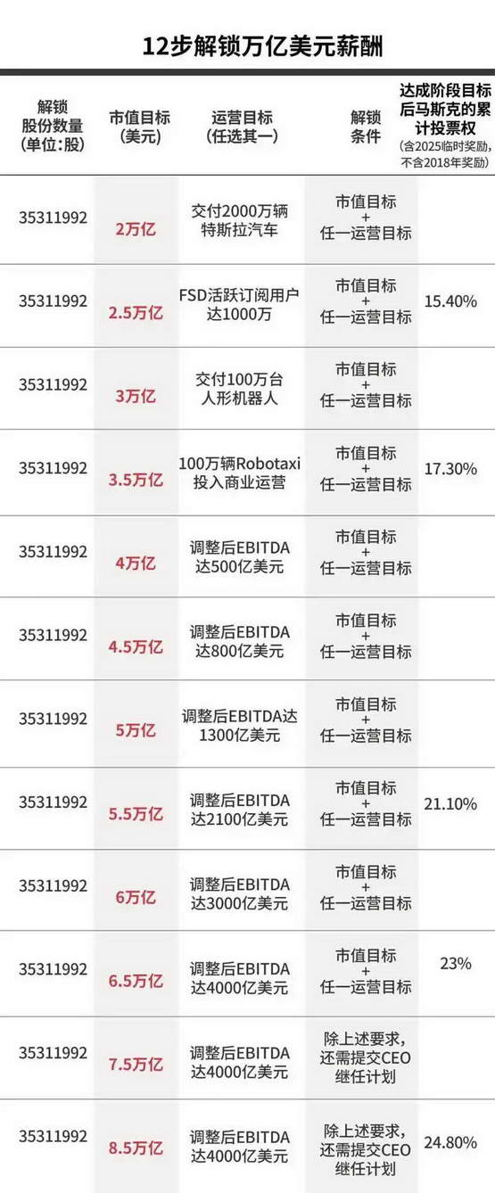 我们先看市值这边,目前特斯拉的市值约为 1.5 万亿美元,前期市值每增加 5000 亿美元为一个节点,到了最后两个节点,这个增幅要求将从 5000 亿提升至 1 万亿。