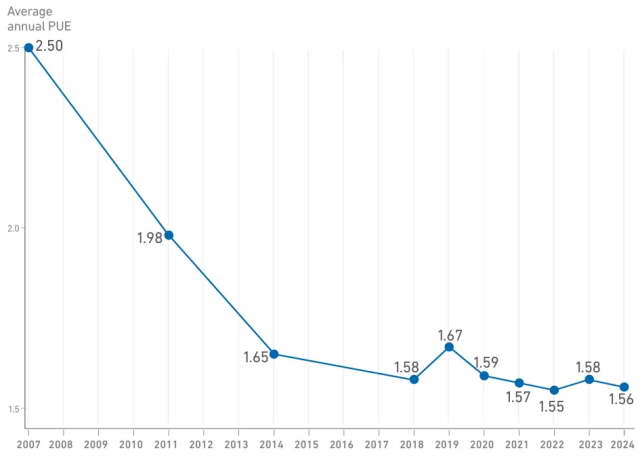 2024 年,全球的平均 PUE 是 1.56。也就是说,只有三分之二的电能用在 GPU 计算上,三分之一消耗在了制冷、供电系统、和照明等等杂七杂八的地方。