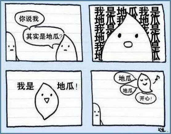 说起来不复杂,做起来可能有些反直觉,因为要抛开自己的情绪只针对问题,要做到也不算难,习惯就好了。突然想起图上这个漫画,就是一种典型的情绪稳定。是人参?很好,很开心。是地瓜?有问题么?没问题,地瓜也很好啊。既然没问题了,那继续很开心~~