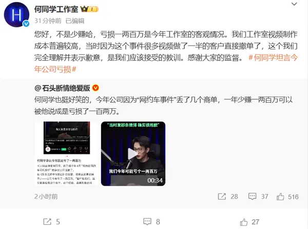 针对部分网友对 “亏损” 表述的质疑,@何同学工作室官微 很快作出回应,明确表示亏损并非少赚,而是今年工作室的客观实际。工作室方面解释,团队视频制作成本本就普遍较高,4 月微博事件发生后,多个正在制作中的客户项目选择撤单,这是导致亏损的核心原因。“我们完全理解客户的决定,对此深表歉意,这是我们必须接受的教训,也感谢大家的监督。” 工作室回应称。