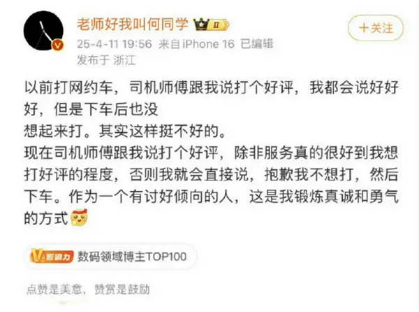何同学就拒绝给网约车司机好评道歉:很多客户撤单了