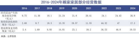 根据财报来看,从 2019 年开始,顾家家居偿还债务支付的现金激增,2020 年、2022 年、2023 年三年,经营活动产生的现金流量净额已经不足以偿还债务,更多的是依靠借款来还债。
