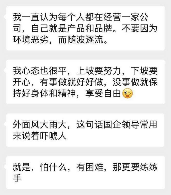 3. 有人说在体制内只要你不追求进步你就是大爷。不过,是否可以一直躺下去未知,看后台一直在不在,看看公司领导班子换届,新领导什么思路,如果后台退了要不要继续给面子。