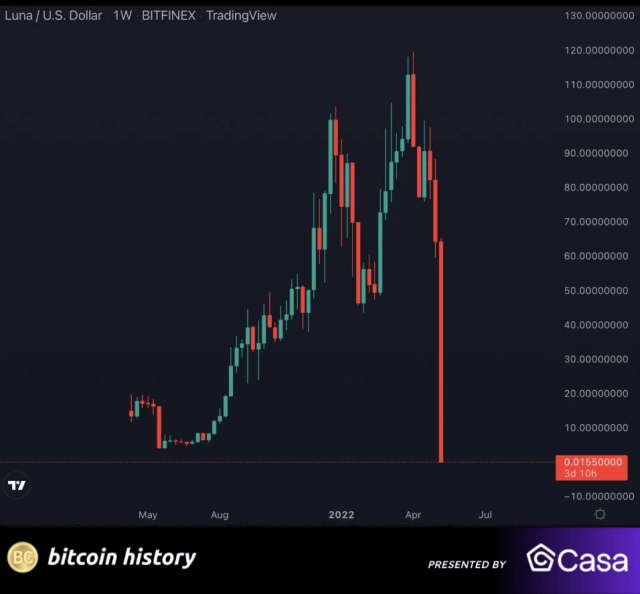 仅几天时间,LUNA 价格就从接近 90 美元一枚跌到了不足 0.015 美元一枚,价格几乎归零,曾经市值高达 400 亿美元的 LUNA 生态瞬间灰飞烟灭,无数人血本无归。
