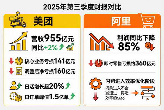 新一季财报里,阿里的利润同比下降了 85%,高盛预估即时零售带来了 360 亿元的亏损。而美团 Q3 营收 955 亿元,同比增长仅 2%,核心本地商业经营亏损 141 亿元,经调整净亏损 160 亿元。