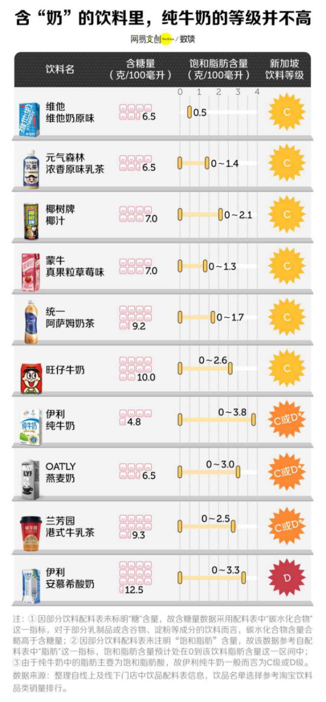 由于全脂牛奶会有饱和脂肪,这就导致其等级可能会落到 C 或 D 级,甚至比不上齁甜的瓶装奶茶 [4]。