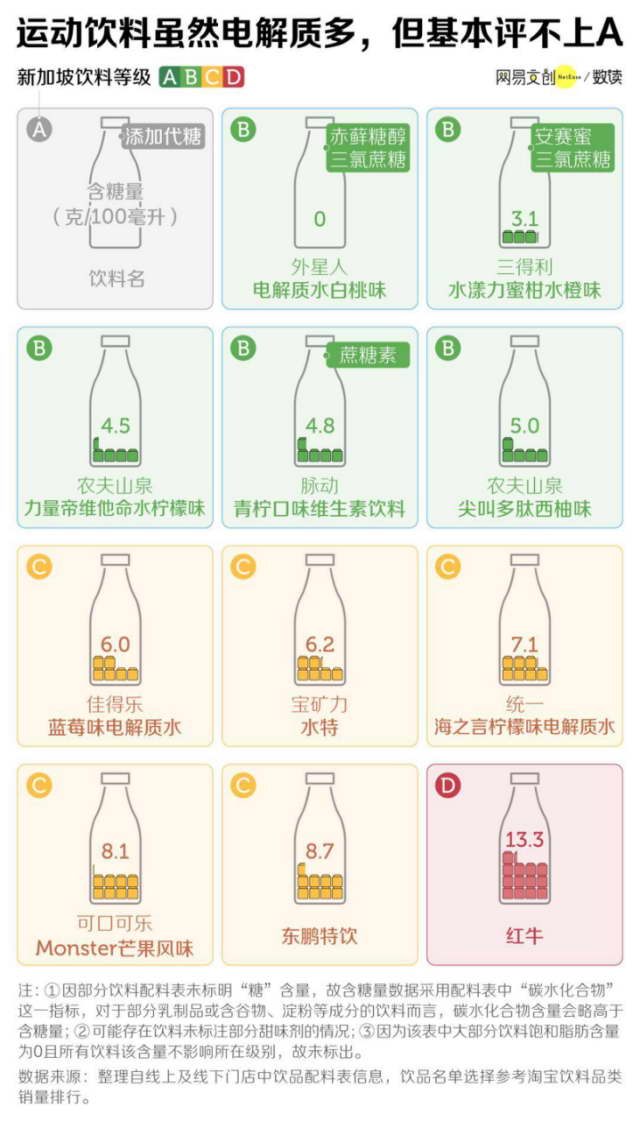此外,各种能补充电解质的运动饮料也基本因为含糖量高评不上 A 级。