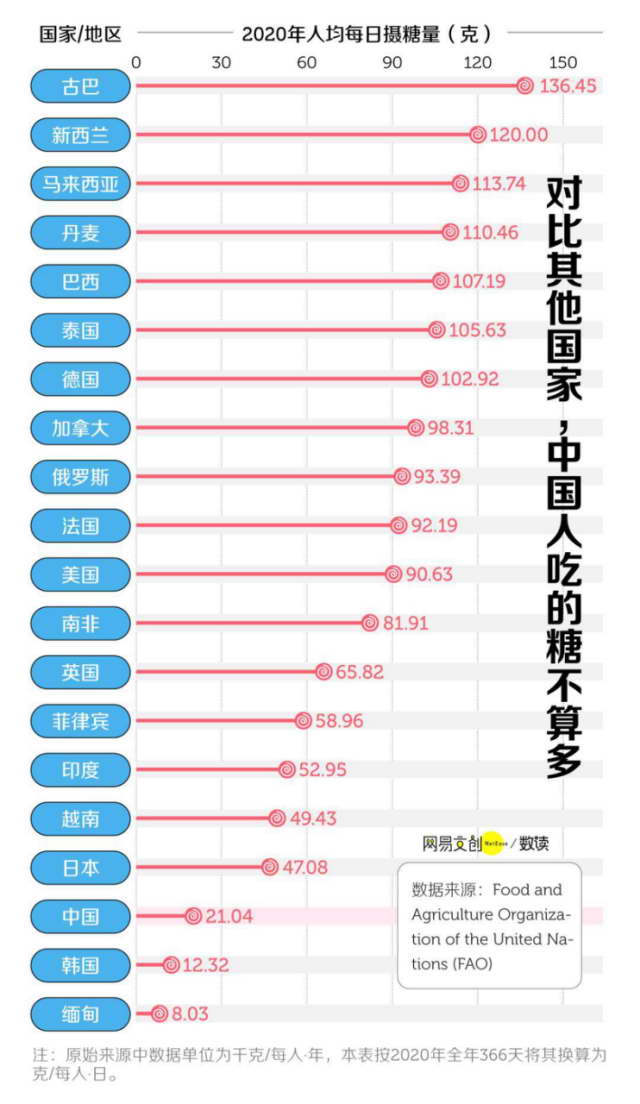 联合国粮食及农业组织的数据显示,2020 年,中国人均每日摄糖量 21 克,在全球排行中处在很靠后的位置。许多国家的这一数字都是中国的好几倍,远超世卫建议的摄入量 [8]。