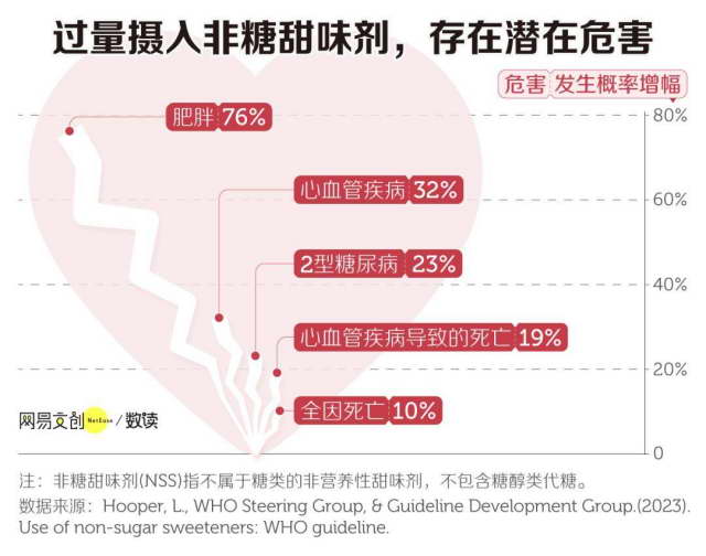 指南里还提到,长期使用非糖甜味剂(NSS)会可能产生许多潜在的不良影响,例如成人患 2 型糖尿病、心血管疾病的风险提高,全因死亡率也会增加 10% [12]。