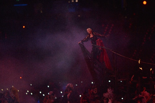 当现场灯光变成了一种诡异的色调,一艘幽灵船缓缓驶入闭幕式的现场时。格莱美获奖女歌手安妮-蓝妮克丝出场,演唱了自己1993年的歌曲《小鸟》。由于蓝妮克丝在开闭幕式上均有表演,白岩松调侃道,“她上演了梅开二度,连英国女王也没有做到。”众所周知,英国女王伊丽莎白二世没有出现在今天的闭幕式。