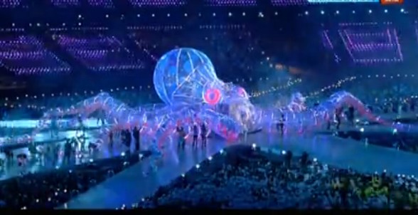今晚舞台中央的大章鱼也是亮点,当流线胖小子带领200位舞者演唱《就是这里就是现在》的时候,一个坐相逼真的大章鱼出现了。白岩松立马想到了章鱼保罗,他对今晚这个章鱼的出现并不意外,“章鱼哥是在英国出生的,它只是成名在德国。”
