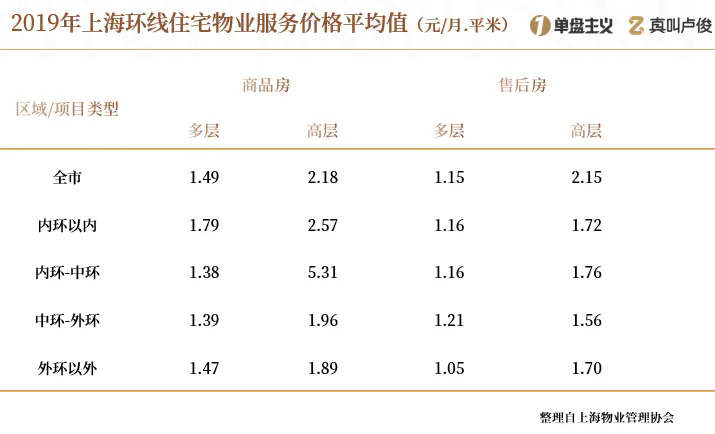 据上海物业管理协会在 2019 年统计,全上海多层商品房物业费平均值为 1.49 元 / 平 / 月,高层则为 2.18 元 / 平米 / 月