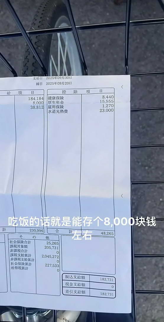 一个在日本当研修生打工的 23 岁(2025 年)中国河南妹子(抖音账号 “徐徐每天开开心心”)发了自己在日本打工的工资(2025 年 9 月)(图一)。
