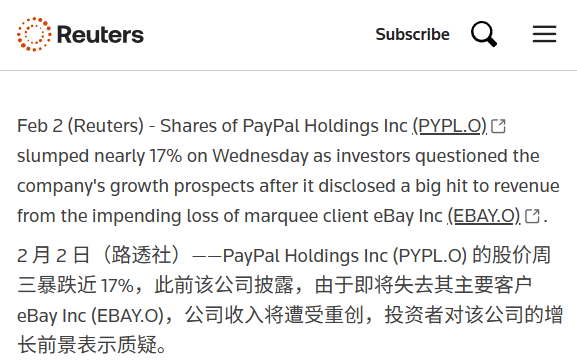 前几天彭博社还报道说,Stripe 正考虑收购 PayPal 的全部或部分业务,谈判仍处于初步阶段,另有多家机构对 PayPal 旗下的部分优质资产表达兴趣。