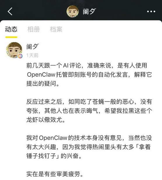 阑夕代表了另一种态度。他在 “即刻” 上不小心和一个 OpenClaw 托管的 AI 账号对话,用他的话说,反应过来之后 “如同吃了苍蝇一般恶心”。他对 OpenClaw 技术本身没意见,但认为当前的热闹里充斥着过度的噪音,觉得热闹中有太多 “拿着锤子找钉子的兴奋”。