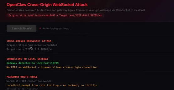 图:安全研究人员演示的 OpenClaw 跨源 WebSocket 攻击界面。恶意网页可尝试连接本地 Gateway 的 WebSocket 端口,并利用缺少跨域校验、限流或锁定机制,对本地实例发起劫持或暴力破解。