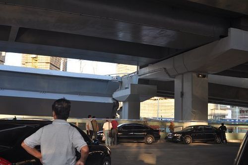 现场已经被封锁,有大量警察和武警站岗,在垮塌的桥梁四周都已设置了警戒线,而观察塌桥视界最好的一栋正在施工的高楼工地门口,有两名工地管理人员模样的人正在守门,记者一进去就被劝出来。