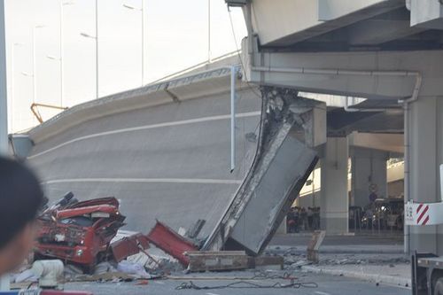 记者现场看到,从桥体结构来看,出事的大货车所停靠的上桥匝道一共有四个桥墩支撑,其中最接近地面的桥墩是一个盖式桥墩,东面支撑该垮塌桥面的撑臂北面部分已经断掉一半,南面完好,最高处的桥墩则有两根立柱支撑,上部靠西一侧承受着引桥半幅桥面的重压,靠东一侧则支撑匝道上桥处,其南面支撑垮塌桥面的一半结构中,也断了大约两米。