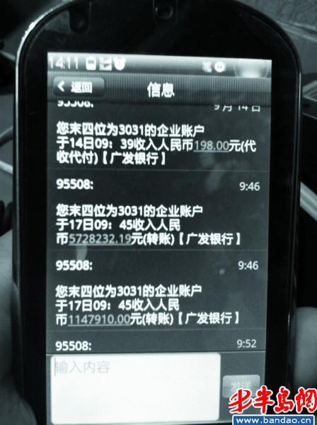 “数额超过万元的进账有98笔,超过10万元的进账23笔。有3笔进账数额在百万元以上,分别是5728232.19元、1147910.00元和1090750.00元。”王先生估算,394条短信上的数额加起来,有1700多万元。