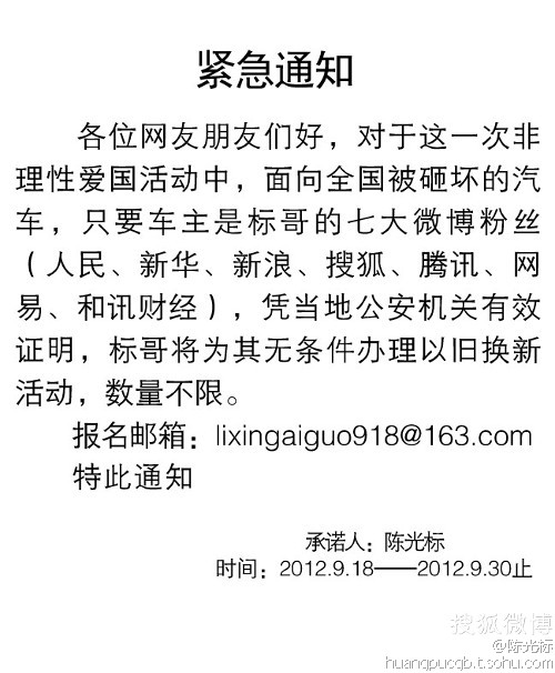 这条名为“紧急通知”的微博是由陈光标的认证微博发出。通知中称:“各位网友朋友们好,对于这一次非理国活动中,面向全国被砸坏的汽车,只要车主是标哥的七大微博粉丝(人民、新华、新浪、搜狐、腾讯、网易、和讯财经),凭当地公安机关有效证明,标哥将为其无条件办理以旧换新活动,数量不限。报名邮箱: