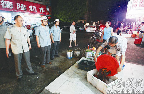 2009年6月,洪山区城管局创立“眼神执法”整治占道。50余名城管执法队员整装肃立一旁,几桌食客原本旁若无人地大吃大喝,最终抵挡不住,将占道的餐桌搬进了店内。