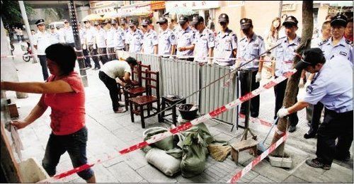 2010年6月28日,洪山区关山街组织城管队员,首尝“铁桶阵执法”,让盘踞社区近半年的占道“钉子户”挪了窝。执法时,数名城管手持盾牌一拥而上,将窝棚围得水泄不通。