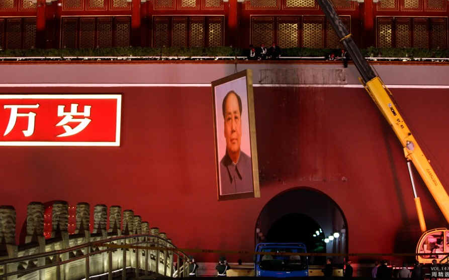 9月28日,北京,工人们更换天安门城楼上的毛泽东肖像,迎接中华人民共和国成立63周年。REUTERS/Jason Lee