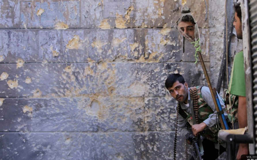 当地时间9月24日,叙利亚阿勒颇,一名自由叙利亚军的战士用玻璃镜片观察敌情。AP Photo/Hussein Malla