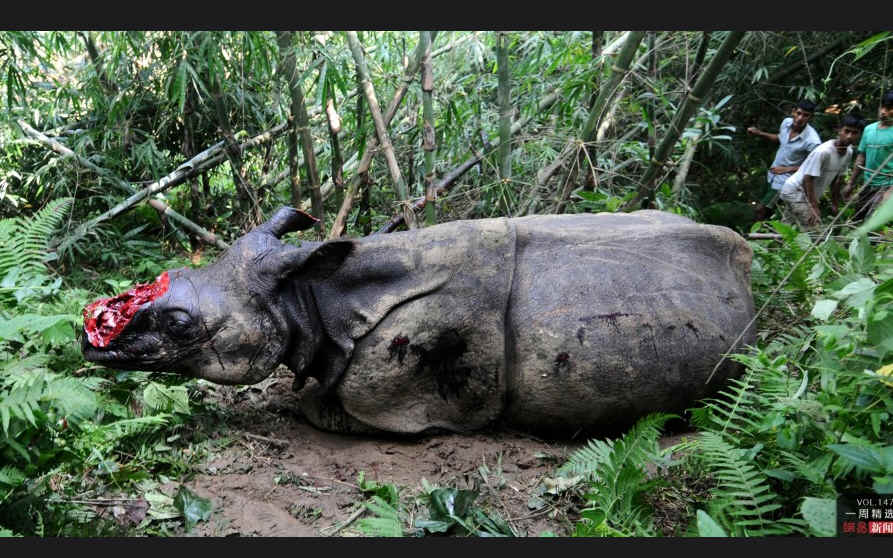当地时间9月26日,印度卡齐兰加国家公园,村民们发现一头被偷猎者割去犀角的犀牛躺在地上奄奄一息。AFP PHOTO/Biju BORO