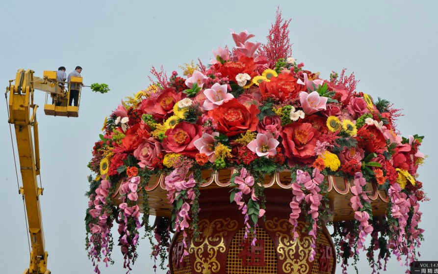 9月22日,北京,工人正在装饰天安门广场国庆主花坛。为庆祝国庆63周年,迎接中共十八大召开,天安门广场中心摆放大型花篮“祝福祖国”。北京市园林绿化局表示,花篮净高13米,篮盘直径11米,是迄今为止天安门广场所布置过的最大花篮。AFP PHOTO/Mark RALSTON