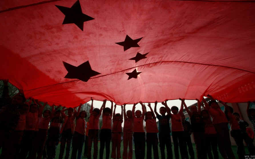 9月27日,济南北全福小学的百余名学生用63块红布织成一个长9米长、6米宽的国旗,在上面绣上五角星。郑涛/CFP