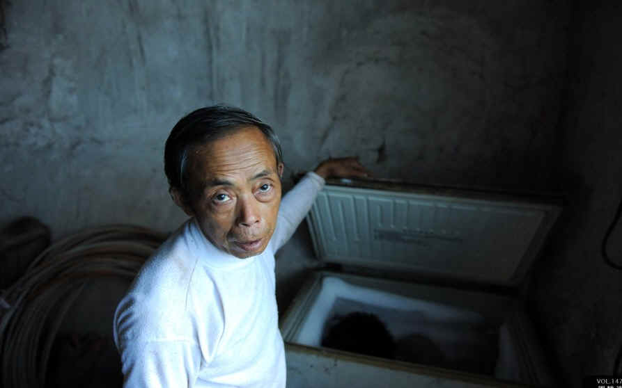 9月25日,重庆开县丰乐街道黄陵村,田秦远的尸体就藏在这个冰柜里,父亲田学明思念时便去看一眼。2006年,田学明的儿子田秦远因白血病去世,田学明将尸体藏入冰柜,一放就是6年。每当想念时,田学明夫妻总会搀扶着安静地站在冰柜旁,呆呆地看上一会,然后离开。田学明说,儿子“在冰柜里,跟活着时一模一样,我儿子就在我身边,从来没离开过。” 欧永/IC