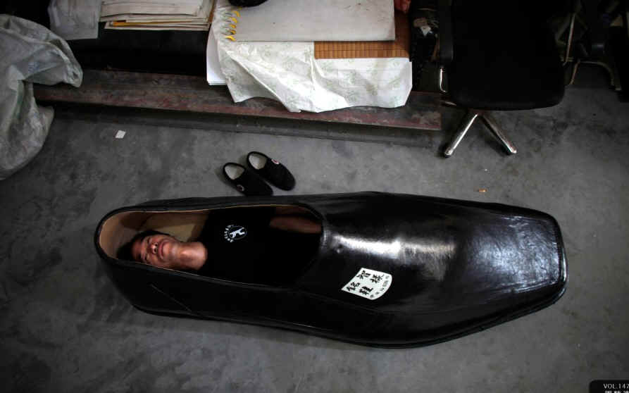 9月27日,浙江温岭,皮鞋设计师陈明志躺在自己制作的1.9米长的鞋子里。陈明智刚刚开始从事制鞋这个行当,在邻居的鼓动下花了两个月的时间做了这只大鞋。这只皮鞋重38千克,造价2000元。REUTERS/Carlos Barria