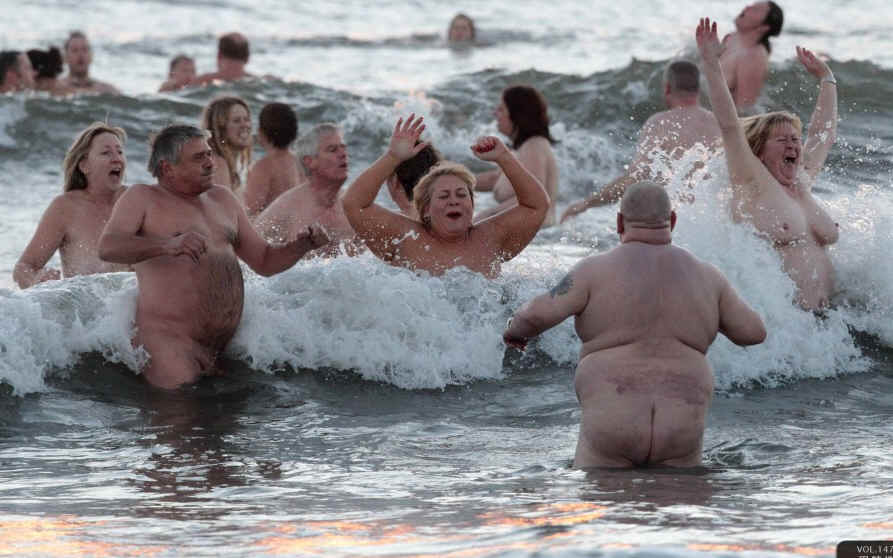 当地时间9月22日,英国诺森伯兰郡,200名裸泳爱好者冲入当地一处海湾,试图打破集体裸泳人数世界纪录。AFP PHOTO/LINDSEY PARNABY