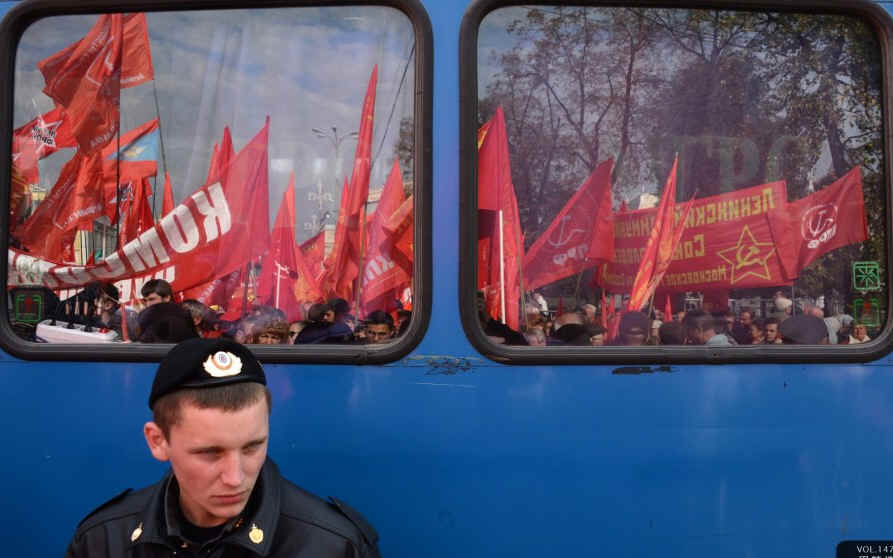 当地时间9月22日,俄罗斯莫斯科,一群共产党支持者举行示威游行,抗议物业费用不断上升。AFP PHOTO/KIRILL KUDRYAVTSEV
