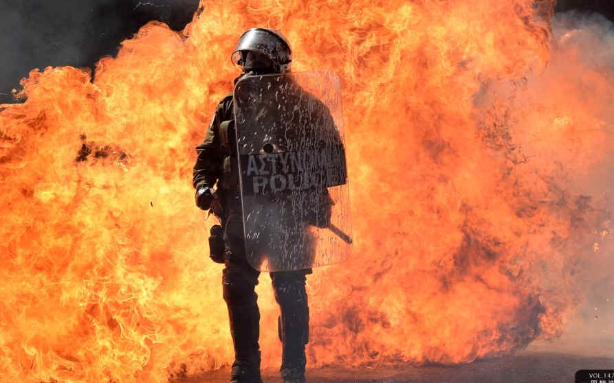 当地时间9月26日,希腊雅典,一名防暴警察站在火墙前。当天,数万名示威者在雅典举行游行,反对希腊政府即将宣布的新一轮的预算削减计划,抗议引发了暴力冲突。AFP PHOTO/ARIS MESSINIS
