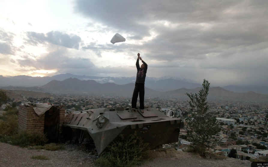 当地时间9月26日,阿富汗喀布尔,一个男孩站在一辆被毁坏的苏联时期装甲运兵车上像放风筝一样放飞一只塑料袋。AP Photo/Ahmad Jamshid