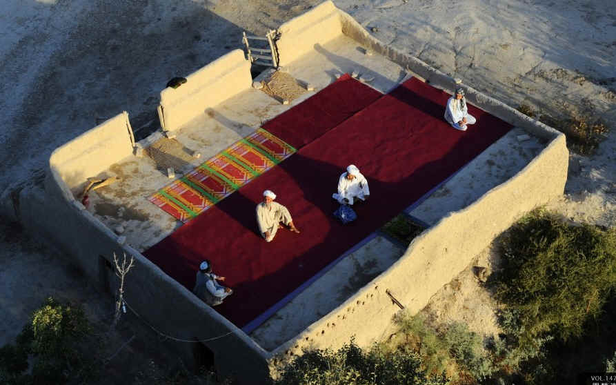 当地时间9月23日,阿富汗巴尔克省,几名男子坐在一处露天的清真寺里。AFP PHOTO/QAIS USYAN