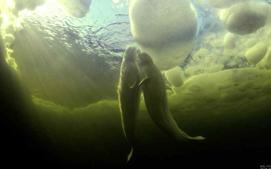 俄罗斯莫曼斯克附近海域,两头濒危的白鲸在水中嬉戏。Joe Bunni/Barcroft/CFP