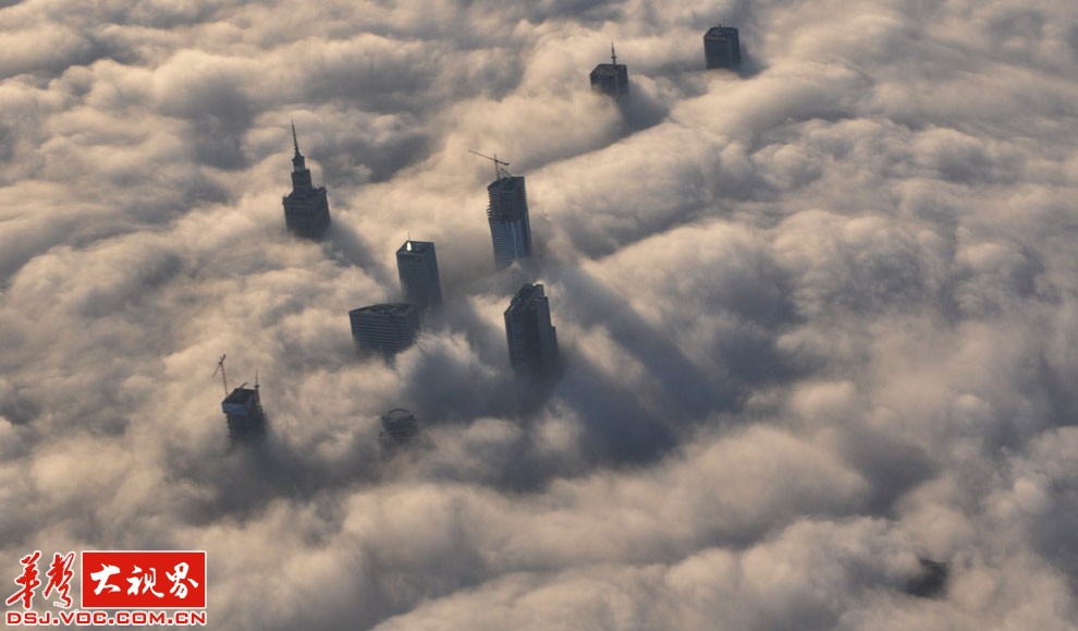 华沙,逐渐升起的迷雾像是一层毛毯覆盖了高层建筑顶端。