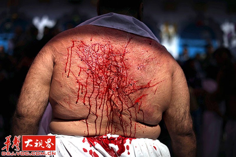 印度,阿姆罗赫:在纪念穆哈兰的游行中,一名什叶派穆斯林赤裸的背上在流血。这个活动是悼念默罕穆德殉难的孙子侯赛因。