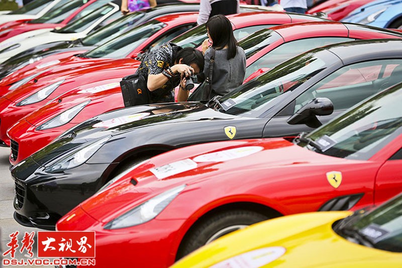 中国,广州:旅客在庆典中为法拉利照相,该庆典是“广州梦-法拉利豪华盛宴”的一部分。