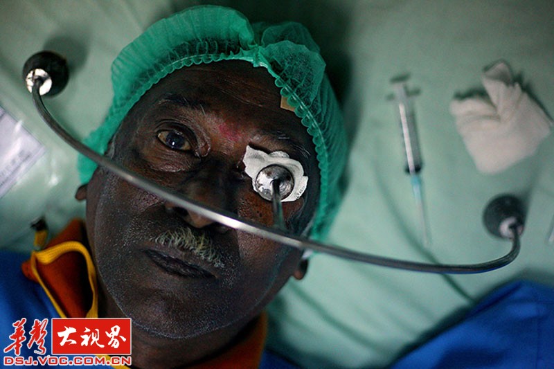 印尼,棉兰:一位病人躺在病床上,在免费的白内障手术之前,他的眼睛正接受局部麻醉。
