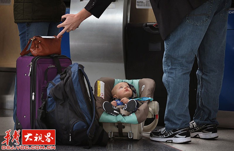 美国,芝加哥:飞机起飞前,当这个孩子的父母在办理登机手续时,他正在一旁睁着无辜的大眼观望。