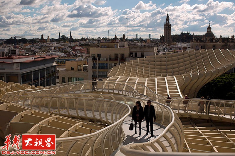 西班牙,塞维利亚:一对情侣在“大都市阳伞”(MetropolParasol)的通道散步,俯瞰这座古老的城市及其吉拉尔达大教堂。大都市阳伞由建筑师JürgenMayerH设计,号称世界上最大的木质建筑。