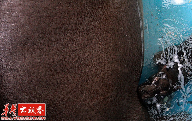 塞尔维亚,贝尔格莱德:五岁大的河马宝宝正由它妈妈喂食。