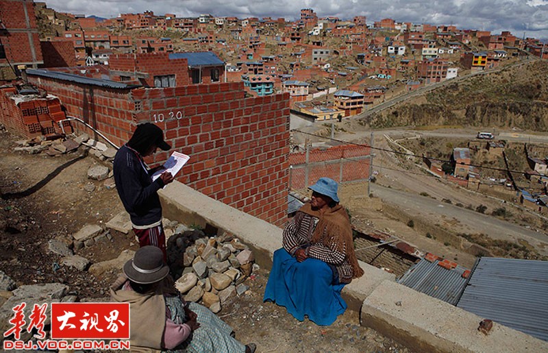 玻利维亚,埃尔阿尔托:人口普查工作人员正在询问一名妇女问题。在这次人口调查中,玻利维亚政府强制要求参与者留在家中。
