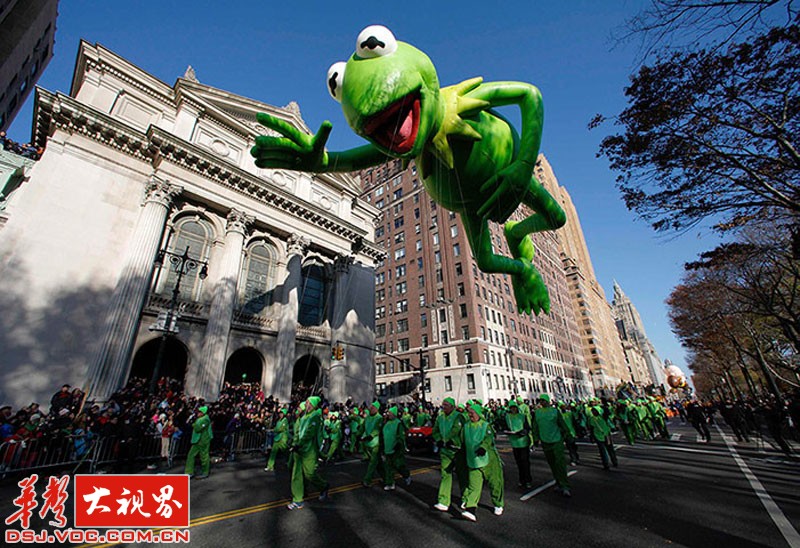 美国,纽约:在第86届梅西感恩节大游行上,科米特(Kermit)青蛙大气球飘浮在中央公园西路之上。
